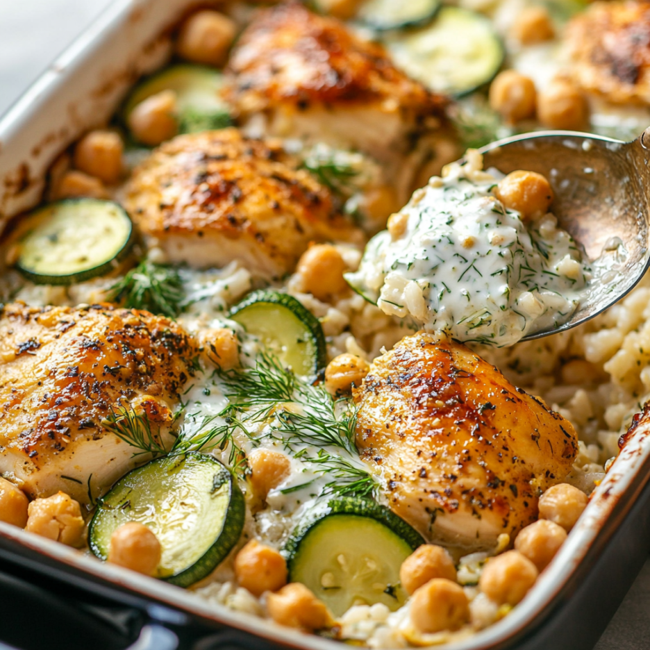 Keywords: Mediterranean chicken casserole, tzatziki chicken bake, healthy Greek casserole, easy Mediterranean dinner, baked chicken with tzatziki